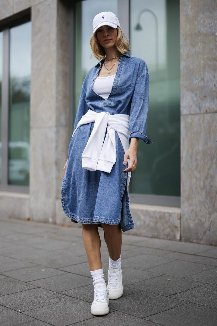 ゆったりとしたライトブルーのデニムシャツワンピースを使ってエフォートレスに。ブルーと好相性な白バッグと鮮やかカラーのスニーカーを掛け合わせ、キレよくまとめました。