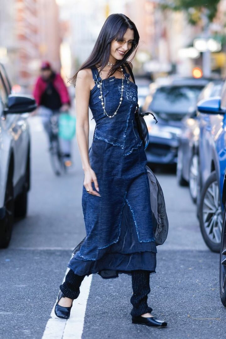 フリンジトリムやティアードデザインの濃紺デニムワンピースを、ロングパールネックレスでクラスアップしていたベラ・ハディッド。黒のニットパンツを忍ばせつつ、フラットシューズを合わせて足元はリラックス。テイストミックスにすることで、彼女らしい個性派スタイルを完成させました。