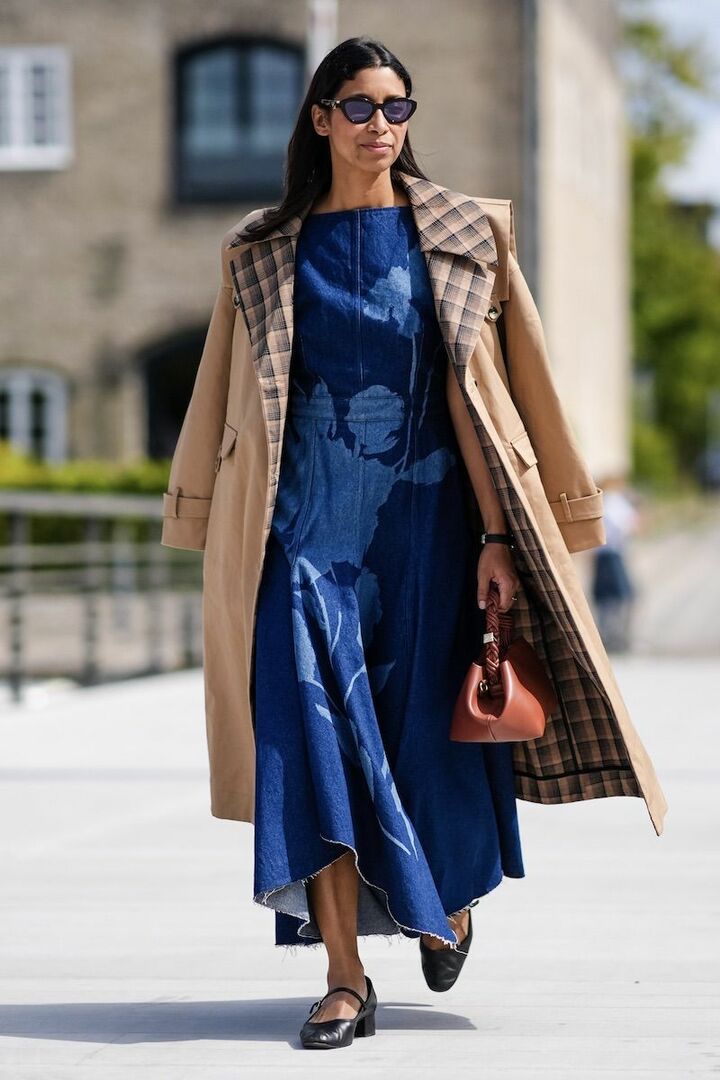 大花柄がアクセントのブルーデニムワンピースに、トレンチコートを肩掛けでプラスし、風をはらませれば爽やかさ抜群。キャメルのバッグやメリージェーンという、グッドガールな小物が上品さを盛り上げます。