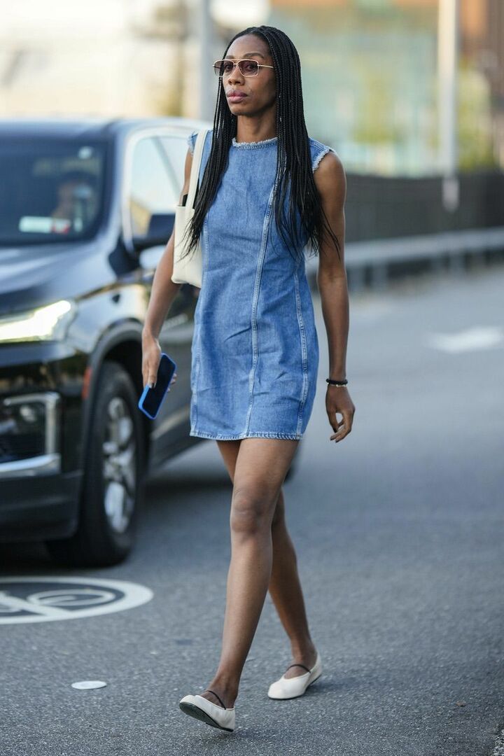 腕と脚をすっきり露出するワンピースは、ライトブルーのデニム素材でヘルシーな表情へ。ボックス型ならすっきり見え、幼さをセーブできます。フラットサンダルとバッグを白で繋ぎ、爽やかにまとめて。