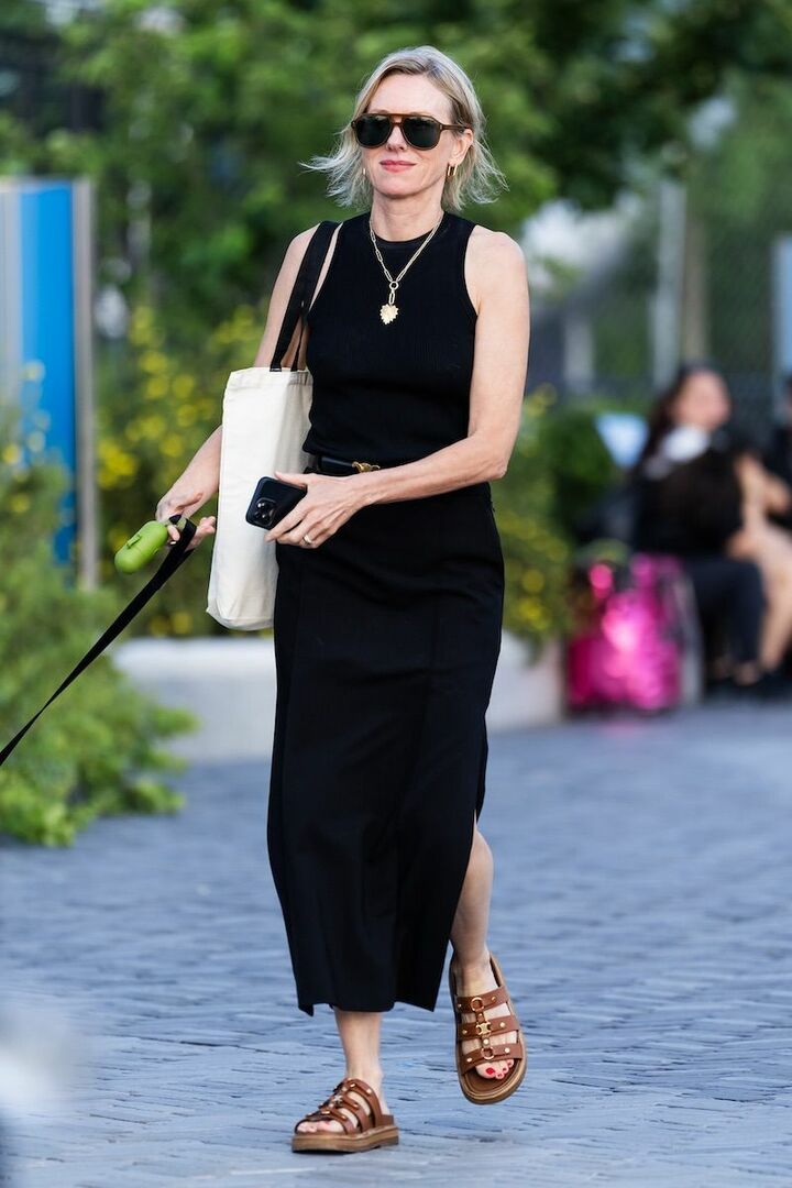 シンプルなカットソーワンピースとフラットサンダルという、コンフォートな着こなしを見せたナオミ・ワッツ。ワンピースは縦長効果が高まる黒を選んだら、程よくボリュームのある茶色サンダルを掛け合わせスタイリッシュさを両立。