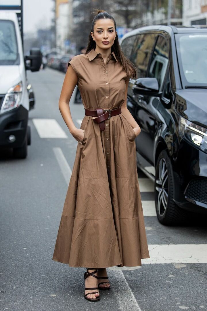 爽やかな印象のフレアシャツワンピースは、ライトブラウンを選び、軽やかさをキープしながらしなやかさを獲得。赤みブラウンのベルトを投入し、くびれを強調すると美バランス。足元にはビターブラウンのレザーヒールサンダルを迎え、ワンカラーのなかに奥行きを授けました。