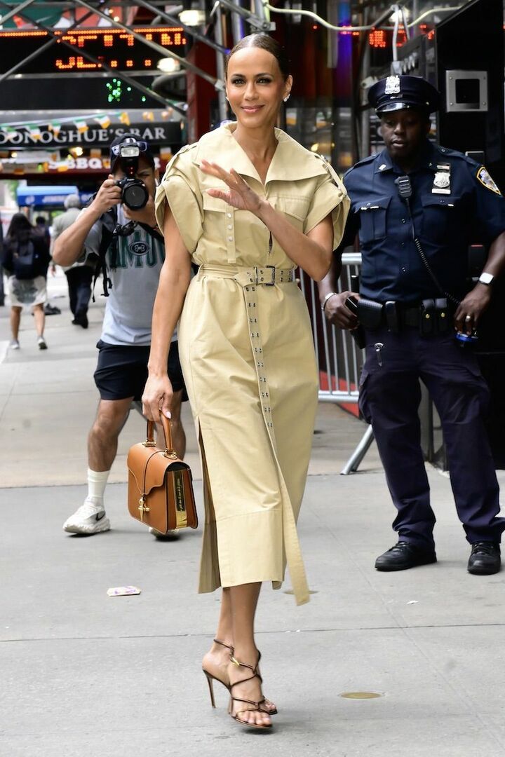 広めのアームホールによる脱力感がこなれた印象を叶える、ベージュのワンピースを着用していた俳優のニコール・アリ・パーカー。キレのよいサイドスリットや共布のロングベルトがあれば、躍動感を演出できます。ハリのある構築的なワンピースなので、シューズは細ストラップタイプを選びメリハリを表現。色はベージュに似合う茶色を採用して。