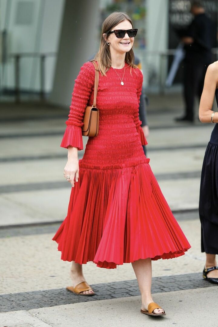 ギャザーやプリーツのディテール、鮮やかな赤が映えるワンピースを、フラットサンダルでカジュアルダウンしてデイリーに引き寄せ。赤と茶色のおなじ暖色でまとめ、一体感を意識すれば好バランスです。