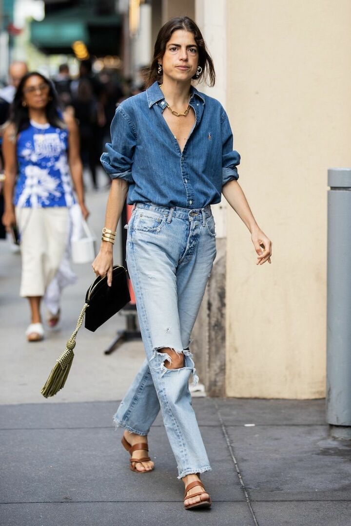 くたっとした形がリラクシーなブルーシャツに、それよりも薄いブルーのパンツを合わせたデニムONデニムスタイル。ヘルシーさ漂う着こなしには、灼けたような茶色のサンダルがよく似合います。デコラティブなアクセサリーやタッセル付きバッグを投入し動きをつけました。