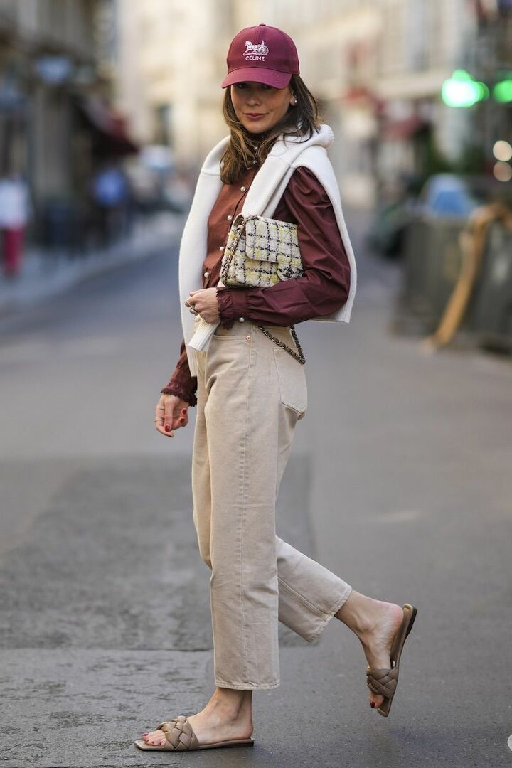 ワインレッドのシャツとキャップ、ライトベージュのパンツ、モカブラウンのサンダルを合わせた穏やかなカラーコーディネート。パンツがデニム素材なので、フラットサンダルを選ぶと調和が生まれます。仕上げに白のニットを肩に引っ掛け、ワントーンがぼんやりしないよう微調整。