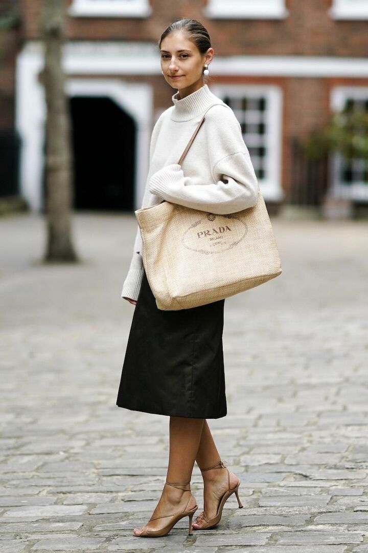 ミニマルシックな白ハイネックニットと黒セミフレアスカートのコンビ。白黒配色の強さをなごませる、ベージュとブラウンの小物をトッピングしてしなやかに。レースアップサンダルで飾り気を出せば、けっして物足りなくなりません。
