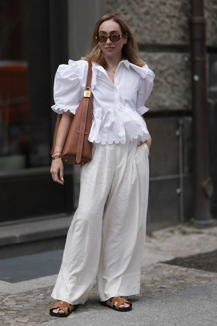 白でまとめたオーバーサイズジャケットとワイドパンツのセットアップ風スタイルは、かさっとした風合いのパンツが軽快さを盛り上げます。白のカットソーとフラットサンダルを投入し、こなれ感を後押し。ナチュラルなブラウン小物ならエフォートレスなムードが高まって。