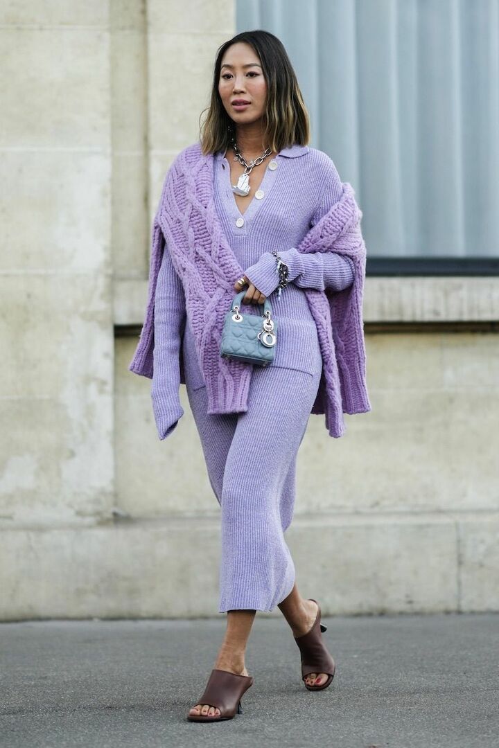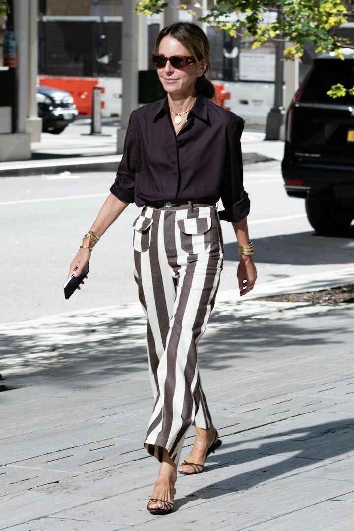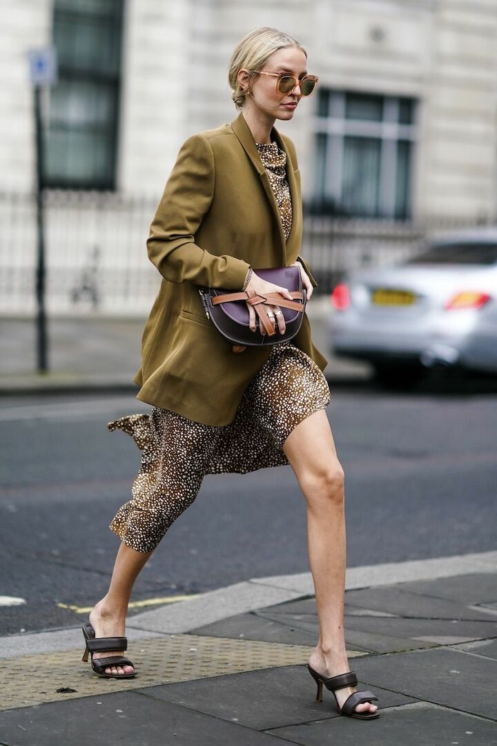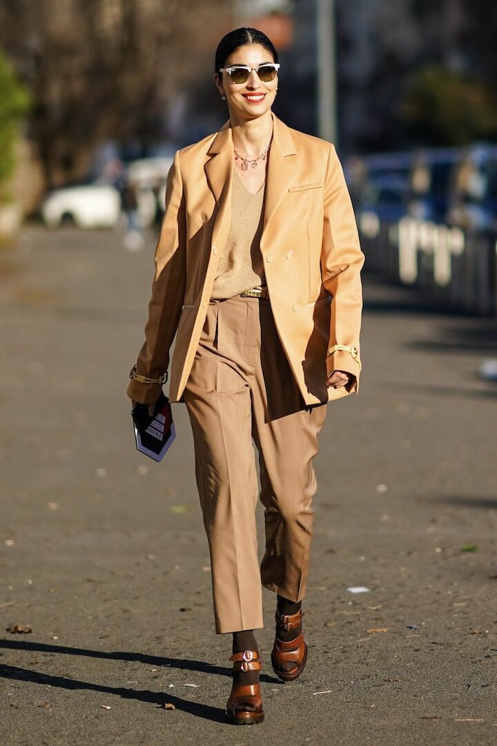 ダークカラーのひとつである茶色は「黒」の着こなしにフィット。また黒の強さを中和してくれるので、親しみやすい印象に。俳優のレベッカ・ホールは、カットアウトトップスで隙を作ったブラックコーディネートに、茶色のサンダルを掛け合わせまろやかに整えました。