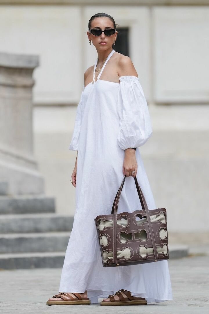 白ワンピースと茶色サンダルは、いずれもグレイッシュな色味を選び、深みをもたらすと洗練された印象に。ドレッシーなワンピースなので、フラットサンダルを使って足元をリラックスさせることでこなれ感をクリア。
