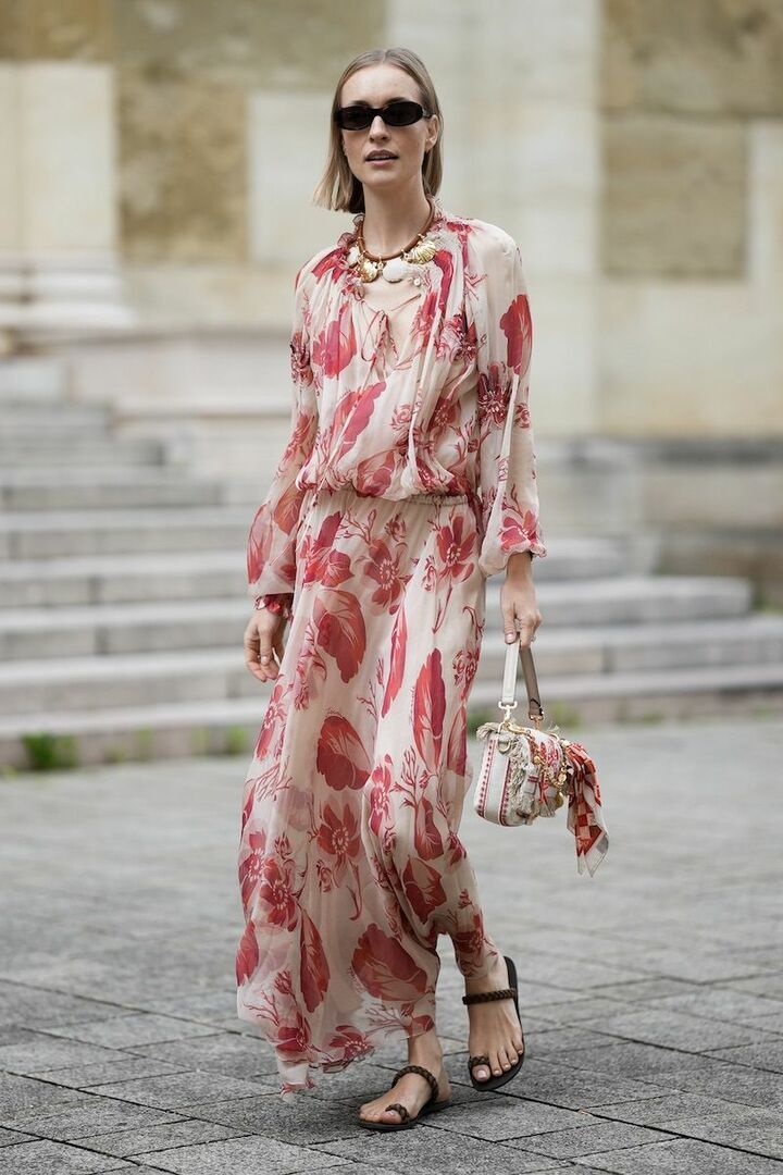 風に舞う鮮やかピンクの花柄ワンピースがあれば、それだけで絵になること間違いなし。デイリー仕様にするために、サンダルは気負いないフラットタイプを選択。サムループの凝ったデザインと品のよいブラウンにすると、ワンピースから浮かずに調和を取れます。