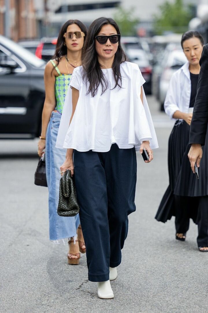 ふんわりとした形が甘い白のブラウスを、チノパンツでドレスダウンして気負いない表情へ。ネイビーなら白と相まって、クリーンなオーラを放つことに成功。