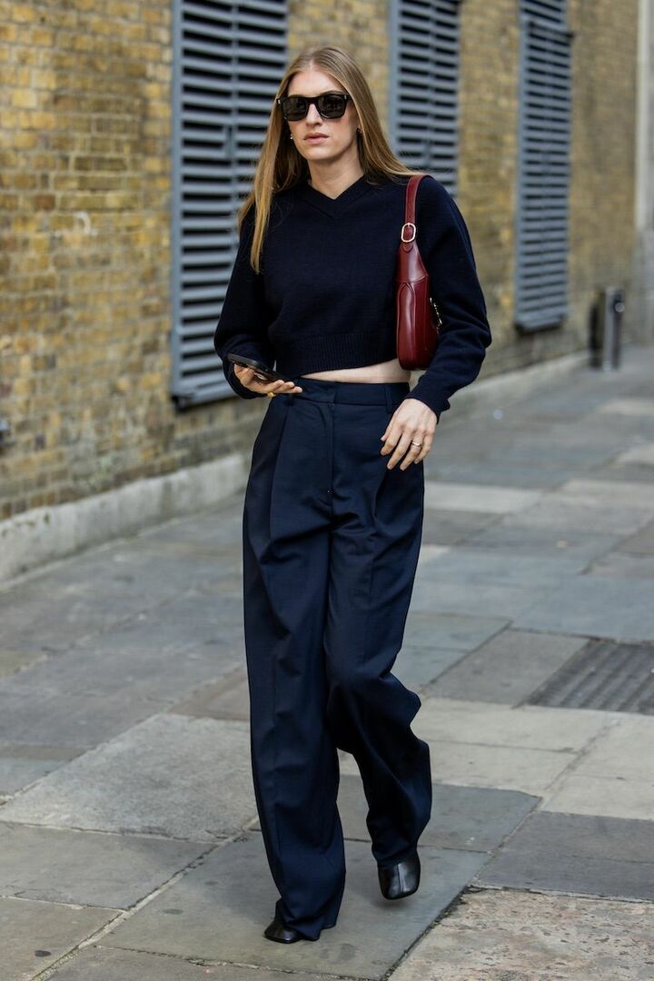 ネイビーでリンクしたニットプルオーバーとチノパンツを使って、きりっと引き締め。ワンカラーが間延びしないよう、ショート丈のトップスにこだわり肌見せそのものをメリハリに繋げて。差し色のバーガンディバッグがマチュアなムードに貢献。