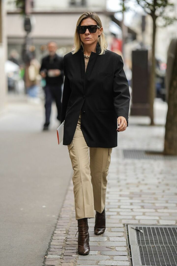 フィット感のあるカットアウトトップスやアッパーにボリュームのあるシューズのように、自然と視線を引き付ける黒アイテムでベージュワイドチノパンツを挟めばすっきり見えて好バランス。