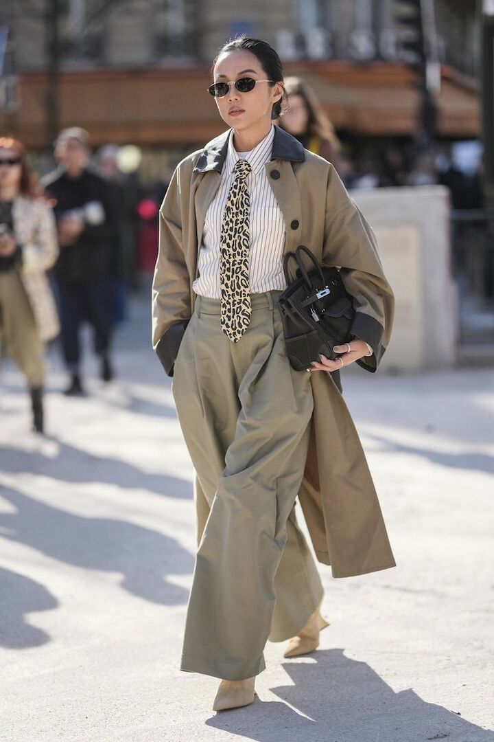 ベージュのワイドチノパンツが膨張しないのは、ロングコートを重ねてIライン効果をプラスしているから。さらにストライプシャツとレオパード柄小物を使って奥行きを生み出し、スパイシーなトラッドスタイルを完成させました。