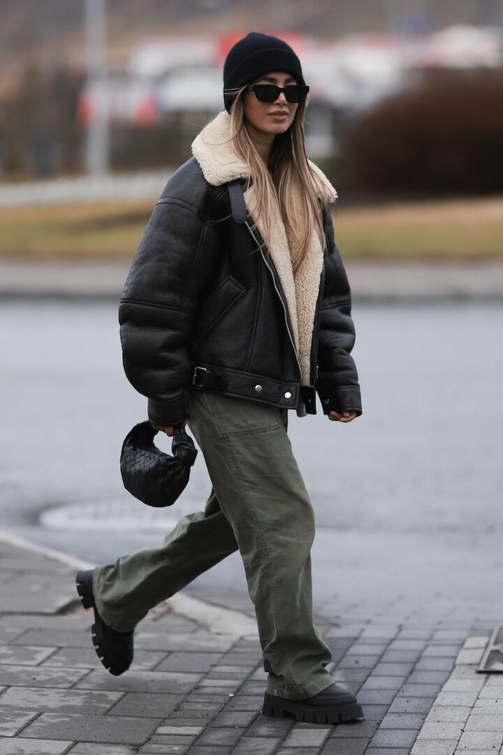 ストイックなフライトジャケットとワークブーツの黒アイテムでカーキチノパンツを挟み、クールさをアシスト。全体にゆったりとしたシルエットなので、ニットキャップを投入して顔周りをコンパクトに見せると好バランス。