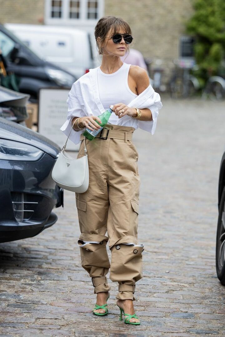 ミリタリーなカーキのカーゴチノパンツに、真っ白なタンクトップとシューズを掛け合わせキレのよいスタイリッシュな着こなしへ。グレートップスをストール感覚で巻きつけたり、ゴールドバッグを携え立体感を意識すれば、シンプルが絵になること間違いなし。