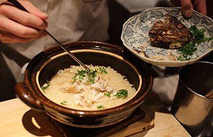 つくり置きは一切せず、オーダーが入ってから調理を開始。30分ほどで完成すると、料理人が客席へ土鍋を運びます。蓋を開ける瞬間こそ『鯛めし』の見せ場。炊きあがったご飯が湯気と芳香を振りまき、高揚感を煽ります。料理人が骨を抜き、ふっくらとした身とご飯を混ぜた状態でテーブル席に再び登場。春の訪れをほっこりと噛み締めてみましょうか。