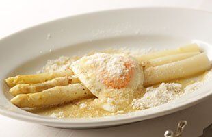 同じく旬を迎えたホワイトアスパラを濃厚なソースとともに楽しむ『フランス産ホワイトアスパラのビスマルク風』