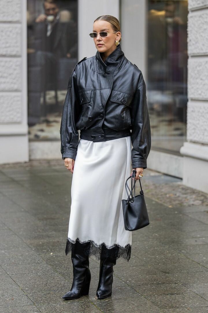 レザー素材のジャケットと小物、サテン素材のスカートを取り入れ、光を味方につければ定番のモノトーンコーディネートがぐっと華やか。繊細なレーストリムのスカートがあるおかげで、キャッチーな甘辛ミックススタイルが出来上がり。