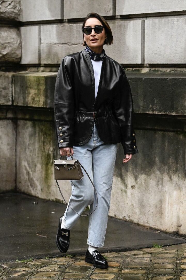 黒を基調とした着こなしは、レザージャケットの優美なツヤがリュクスな雰囲気を押し上げます。白のハイネックブラウスを忍ばせつつ、クラシカルなスカーフを投入してエレガンスを後押し。