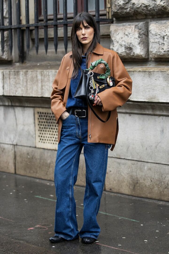 ジャケットとパンツのデニムセットアップは、濃いめのブルーをセレクトしてネイビーのような知性を宿して。黒レザーのベルトで境界線を明確にしながら、引き締めを実行。明るいブラウンのレザージャケットをレイヤードしてしなやかさを足し、大人らしく。バッグにあしらったスカーフやチャームがキャッチーさに貢献。