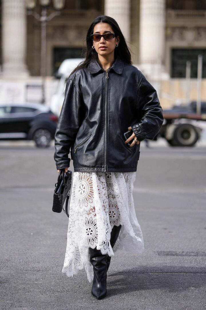 大きめの花柄が視線を引く総レースの白スカートを合わせ、黒レザージャケットにコントラストをたっぷりと授けて。足元でも黒レザーを繰り返すと、スカートのエアリーさを一層盛り上げることができます。
