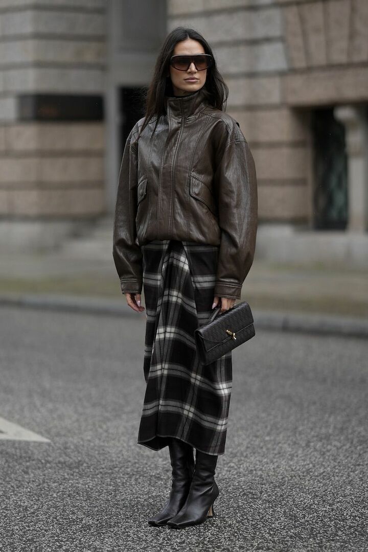 グッドガールなチェック柄のスカートは、深みのあるビターブラウンのワンカラーにして甘さが強く出過ぎないように。さらにレザー素材のジャケットや小物がスパイスを加えてくれるから、大人の理想とするフェミニンに着地します。