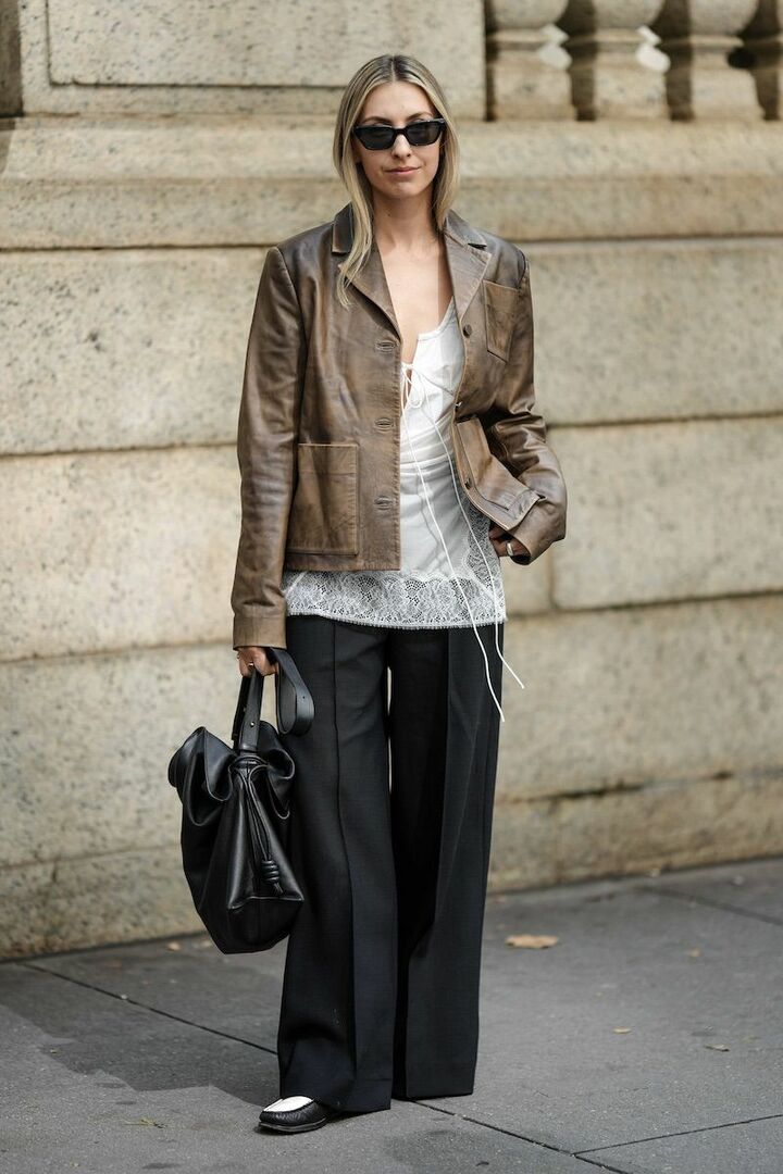 ワイドデニムパンツとムートンブーツのコンフォートスタイルを、レザージャケットによって引き締め。カジュアルなボトムにマッチするよう、余白のあるジャケットを選ぶと調和が生まれます。スカーフをラフに垂らし、Iラインをつくればオーバーサイズの着こなしがぼんやりしません。