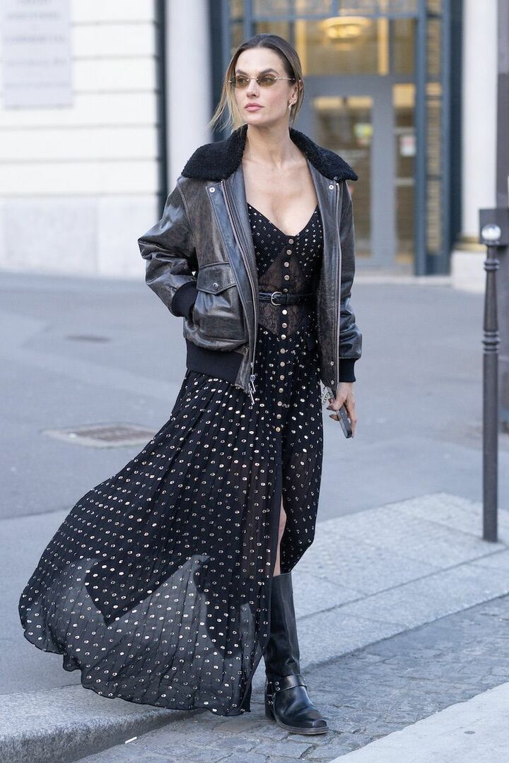 裾が翻る、シアー素材のドット柄ワンピースをまとい着映え力をアップさせたアレッサンドラ・アンブロジオ。タフな黒レザージャケットを迎えれば黒のなかに奥行きが生まれ、のっぺりしません。さらにしっかり露出したデコルテそのものもメリハリに繋がって。