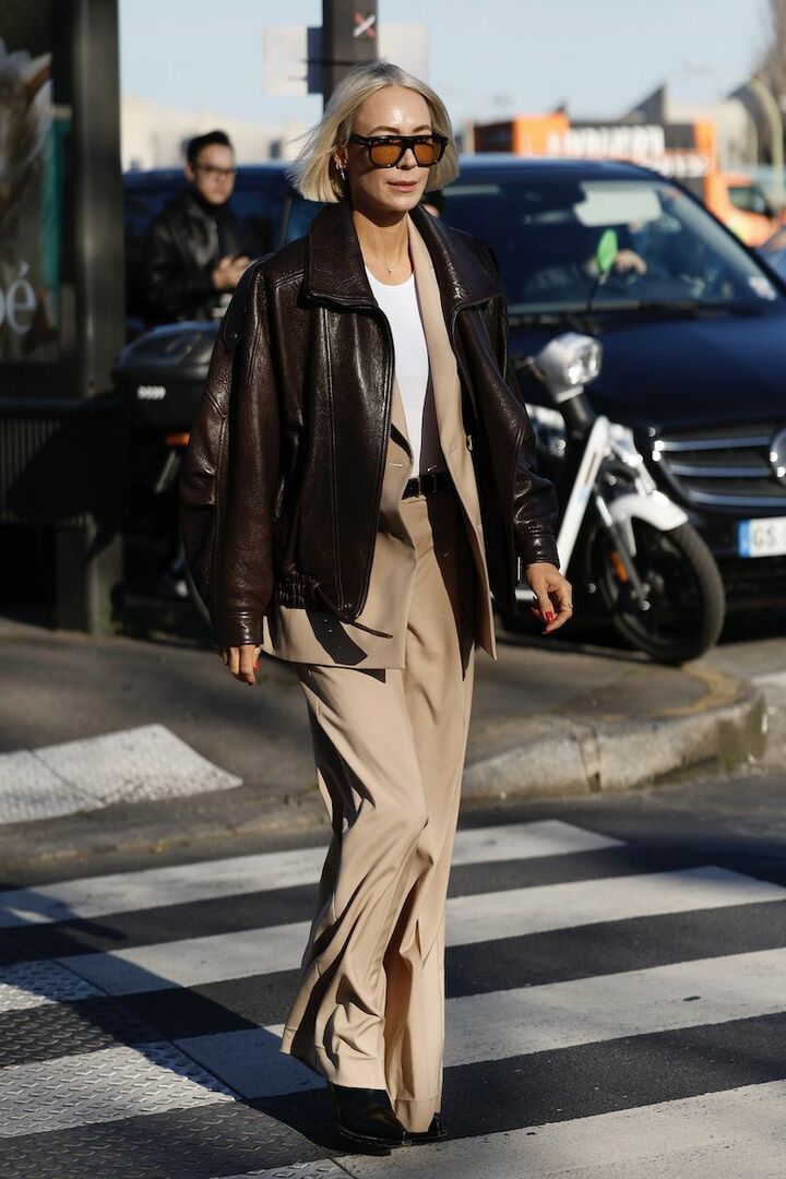 品のよさ漂うベージュのスーツに、レザージャケットを重ねてスパイスをトッピング。黒よりも柔らかい茶色にこだわれば、ベージュにマッチして上品さをキープできます。トップスはプレーンな白カットソーを選び、適度な抜け感をオン。