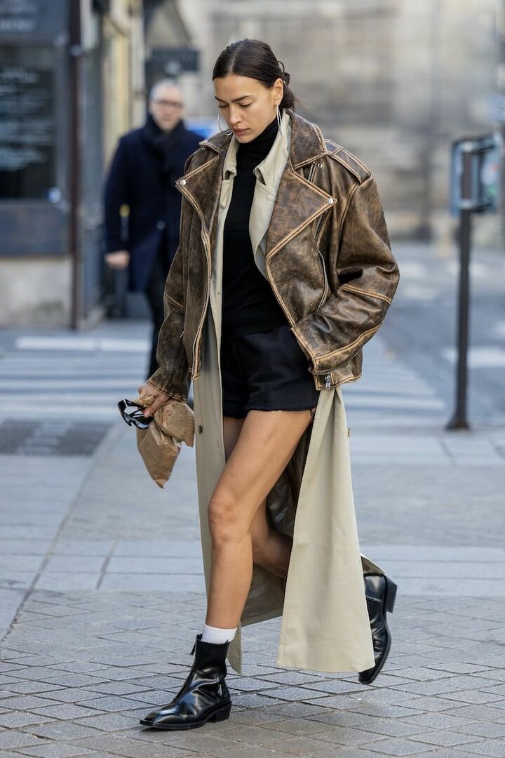 ベージュトレンチコートとブラウンレザージャケットの、上級者なレイヤードスタイルを披露したイリーナ・シェイク。ロングコートをジャケットで覆うだけで新鮮さを獲得できます。凝った重ね着を主役にしたいから、ほかのアイテムは黒でまとめてすっきりと。