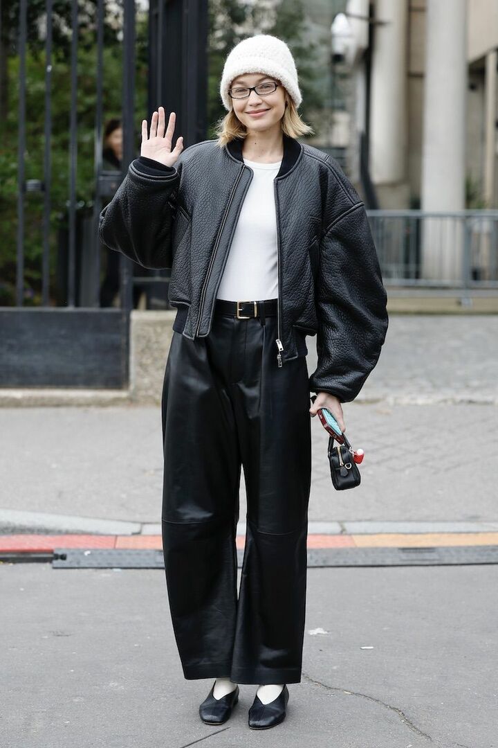 ジャケットとパンツを黒レザーで統一し、モード感を演出したジジ・ハディッド。清楚な白をバランスよく配置しつつ、フラットパンプスでカジュアルダウンすると緊張感が和らぎ、気張って見えないちょうどいいバランスにまとまります。