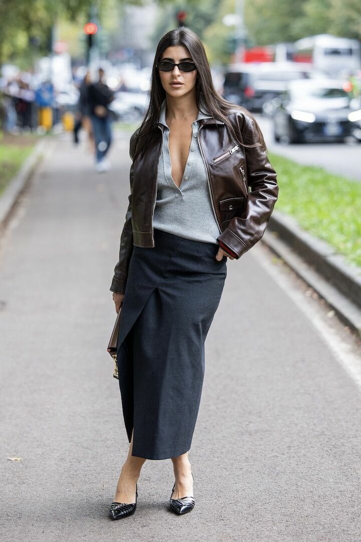 フィット感のあるトップスとスカートは、グレーのなかに濃淡をつけ流れるようなグラデーションをメイク。スタイリッシュなグレーの装いには、ぴりっとスパイシーなビターブラウンレザージャケットがしっくり。