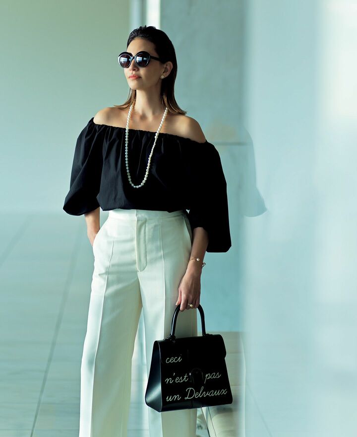 「おなじみのモノトーンの着こなしも、トップスをボウブラウスからオフショルダーに着替えるだけでスタイリッシュに」(スタイリスト・高橋リタさん)。