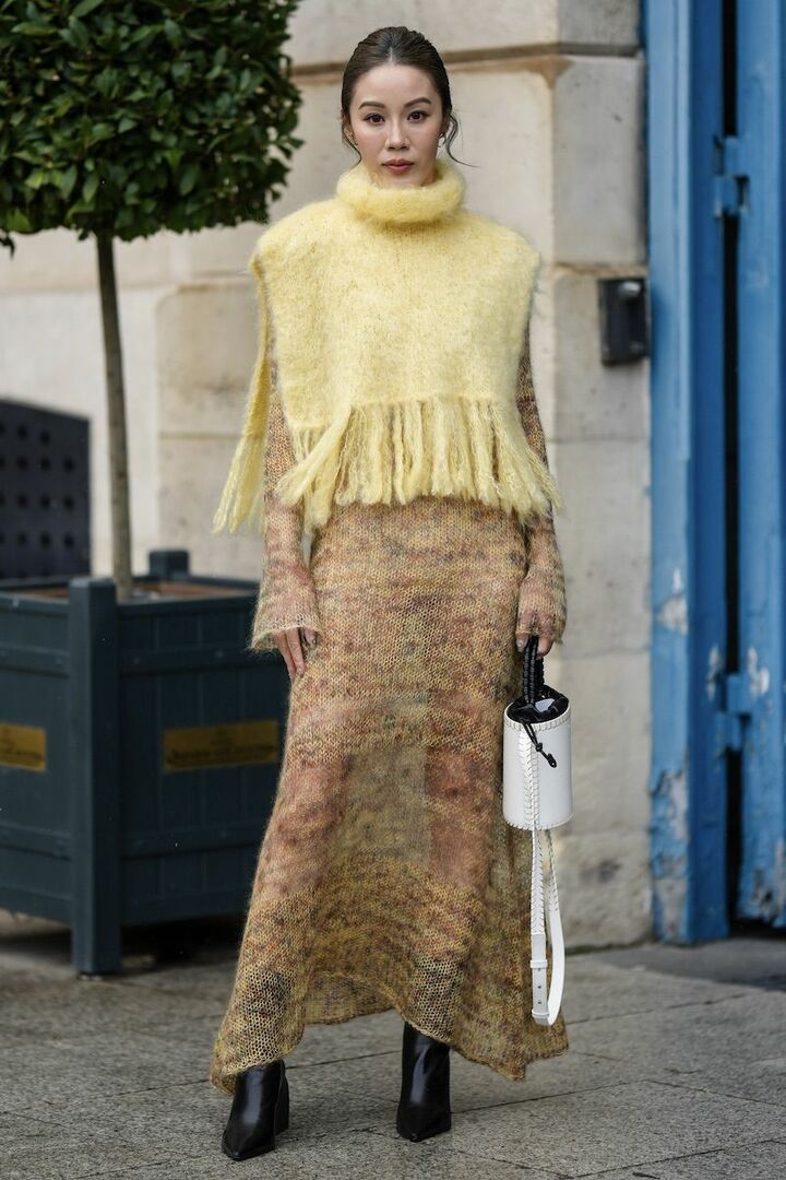 メランジニットが立体感に繋がるワンピースに、淡いイエローのフリンジニットベストを重ねてフェミニンを堪能。優しく包み込んでくれるようなニット、暖色の色合わせで温感をアピール。白黒小物で締めるとほっこりせずに良バランス。