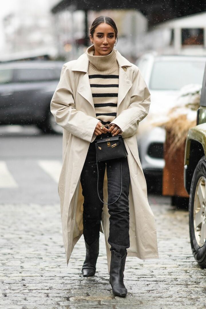 クリームホワイトのボウタイブラウス、ブラウンのベロアジャケットとベージュトレンチコートの巧みなレイヤードスタイルを披露したケイティ・ホームズ。ライトブルーデニムでカジュアルダウンしつつ、パンプス感覚の黒ショートブーツを添え、装いをデイリー仕様にシフト。重ねの多い上半身とも好バランス。