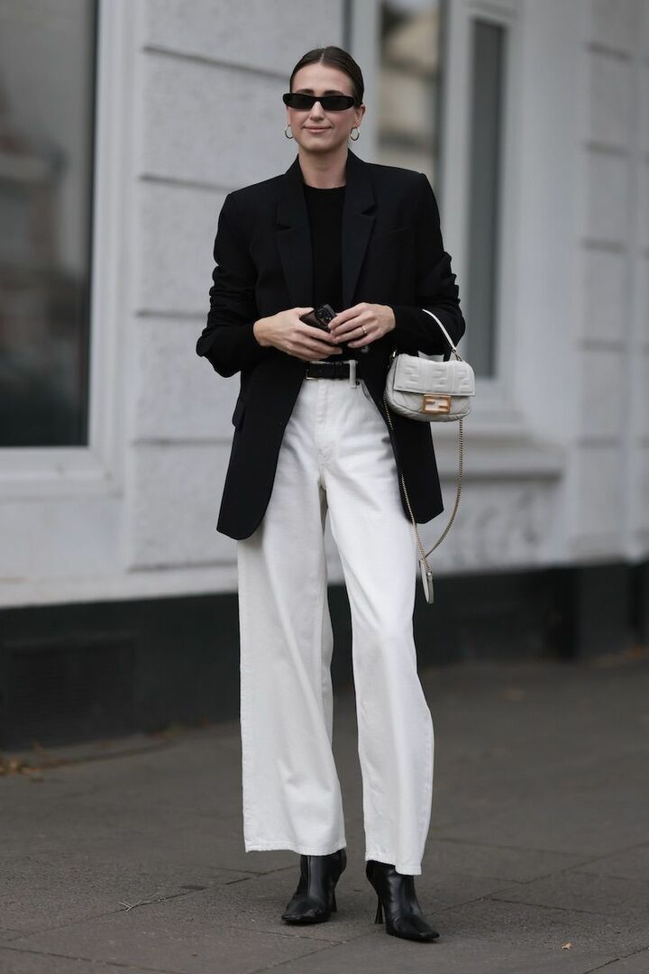 白のワイドデニムパンツが黒ブーツの存在を包み込むように受け止め、足元だけが浮かないバランスに。重心が下がりがちなブーツスタイルも、ゆとりのあるパンツとなら視線が分散され、軽やかな抜け感が生まれます。トップスとジャケットは黒で引き締め、デニムのクリーンさをきわ立たせて。
