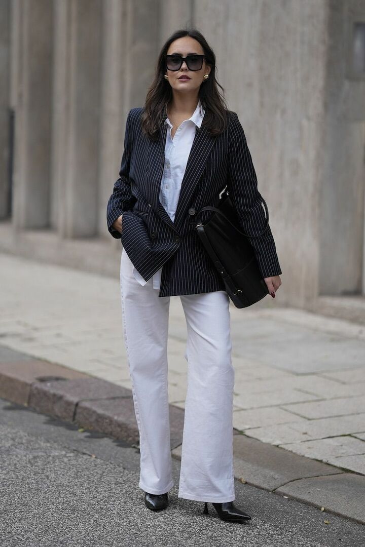 キレのよい白黒配色、シャツとダブルブレストジャケットという端正なコーディネートは、フレアデニムパンツでソフトに見せると親しみやすい印象に。ふわりと広がるパンツの裾からブーツのスマートなヒールを覗かせ、レディをひとさじ。