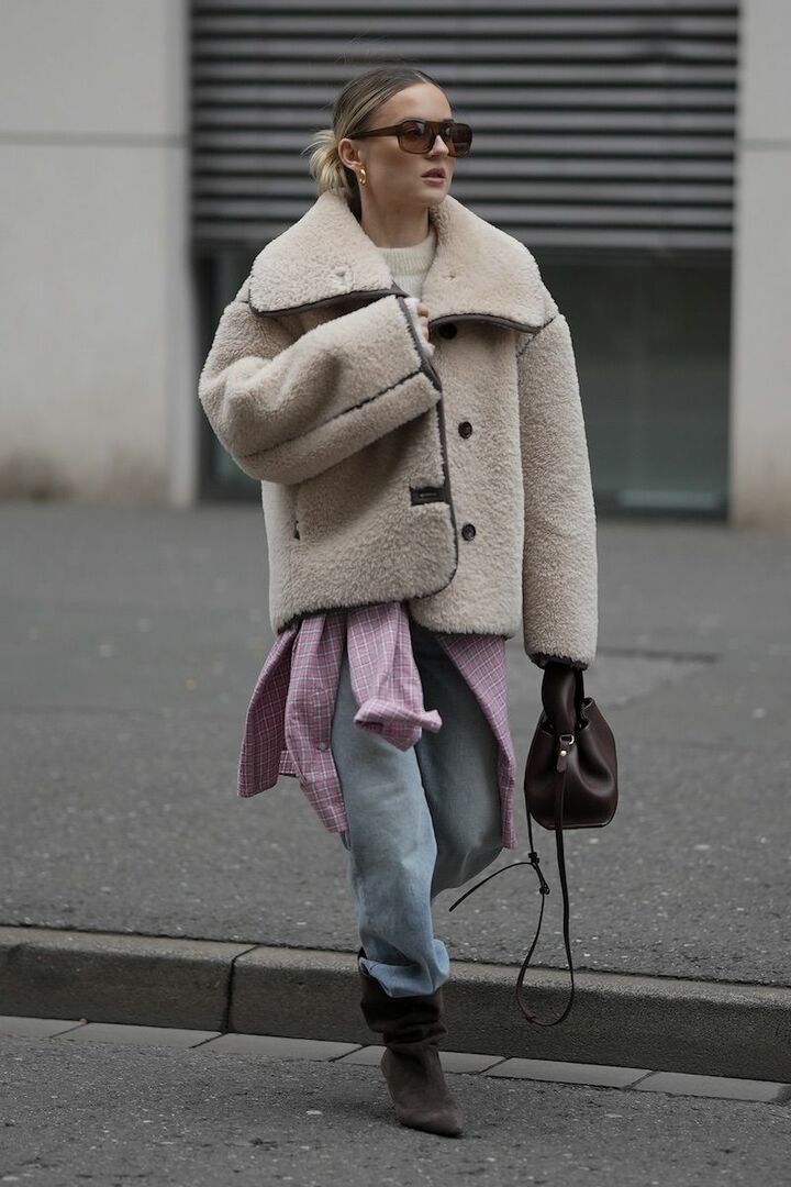 スタイリング全体の重心を安定させる鍵となるのが「ワイド」デニムパンツ。ブーツのデザインやボリュームを選ばないから、足元だけが悪目立ちせず、好バランスに整います。さらに余白のあるシルエットが、今っぽい抜け感を演出。