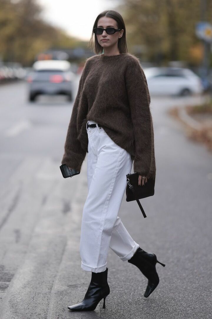 ピンヒールの黒ショートブーツがもたらす切れ味が、ロールアップした白ワイドデニムの軽快さと共鳴。ブラウンのニットでぱきっとした白黒配色をやわらげ、デイリーに馴染む大人カジュアルに。