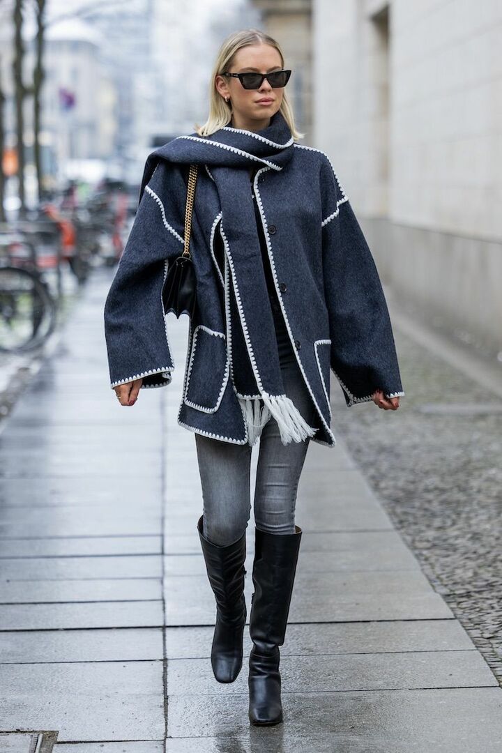 ぴたっとしたスキニーデニムパンツと、履き口にややゆとりのあるロングブーツを合わせ、太もも周りをすっきりと補正。脚線を拾いすぎないブーツのシルエットが、美脚効果を後押しします。グレーとブラックのシックな配色が、スタイリッシュなムードに直結。