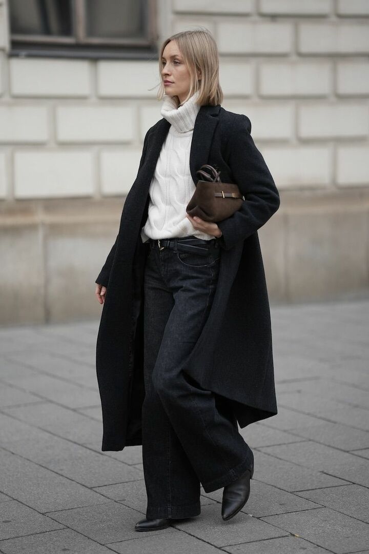 足元をひと続きに見せる、黒のパンツとブーツですっきりと。カジュアルなワイドデニムパンツがあるからこそ、ブーツのほのかな光沢が浮かび上がり、端正な面持ちに。黒のコートで全体をなじませたら、白タートルニットで顔周りに明るさをプラス。