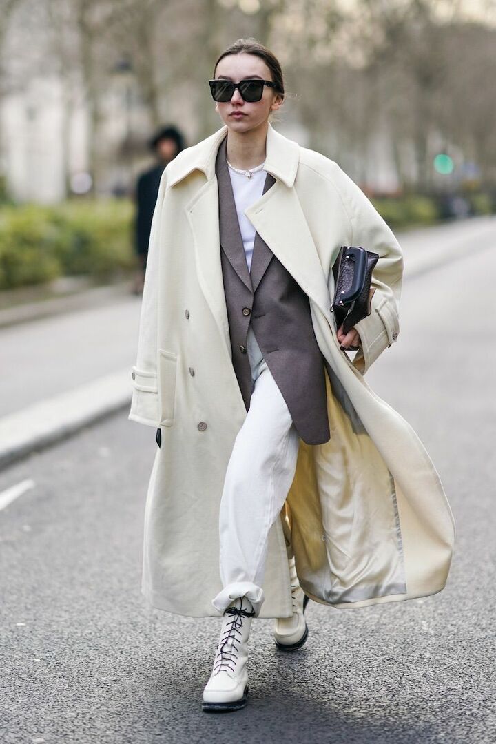 ワイドデニムパンツの広がりを下まで繋ぐ、ボリュームのあるプラットフォームのシアリングブーツ。クラシカルなベージュのチェスターコートで縦のラインを促し、ほっこりしないように調整。キャメルとベージュの柔和な色のなかで、混じりけのない白がよく映えて。