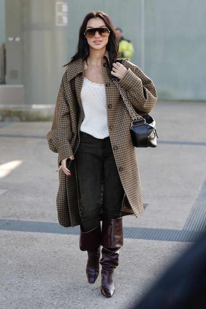 フィット感のある濃紺スキニーデニムパンツとスリムなブラウンロングブーツを一体化させ、下半身をすらりと補正。ヒップをカバーする丈感のオーバーサイズジャケットをプラスし、抑揚のあるシルエットを描けばパーフェクト。