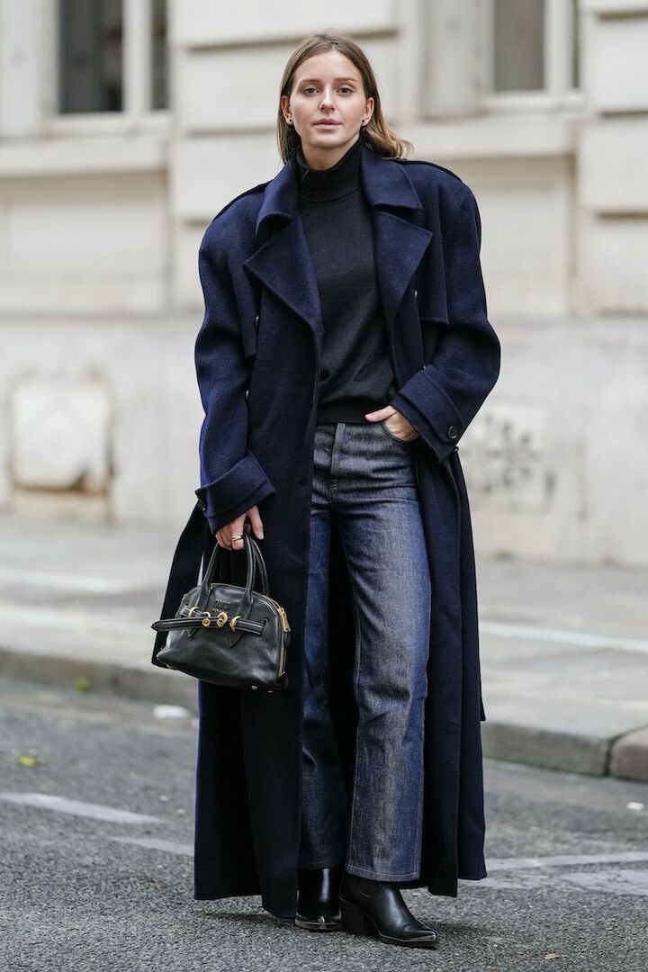 グラマラスなマキシコートと、真っ直ぐな形のデニムパンツ。重たくなりがちなネイビーのワントーンは、存在感が控えめなショートブーツで力を抜いて軽やかに。微光沢感のあるバッグとブーツが、佇まいをクワイエットラグジュアリーへと誘います。