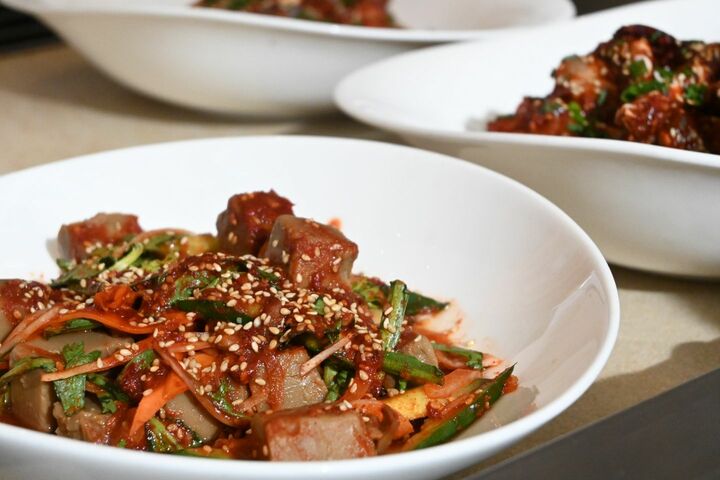 筆者が特に気になったのが、こちらの「どんぐりの寒天スパイシーサラダ トリュフソース」。韓国ではどんぐりの澱粉を粉末状にした「トトリムク」という食材が親しまれています。ニュルッとした食感の寒天を、野菜とともにしっかり辛めの調味料で和えたサラダです。