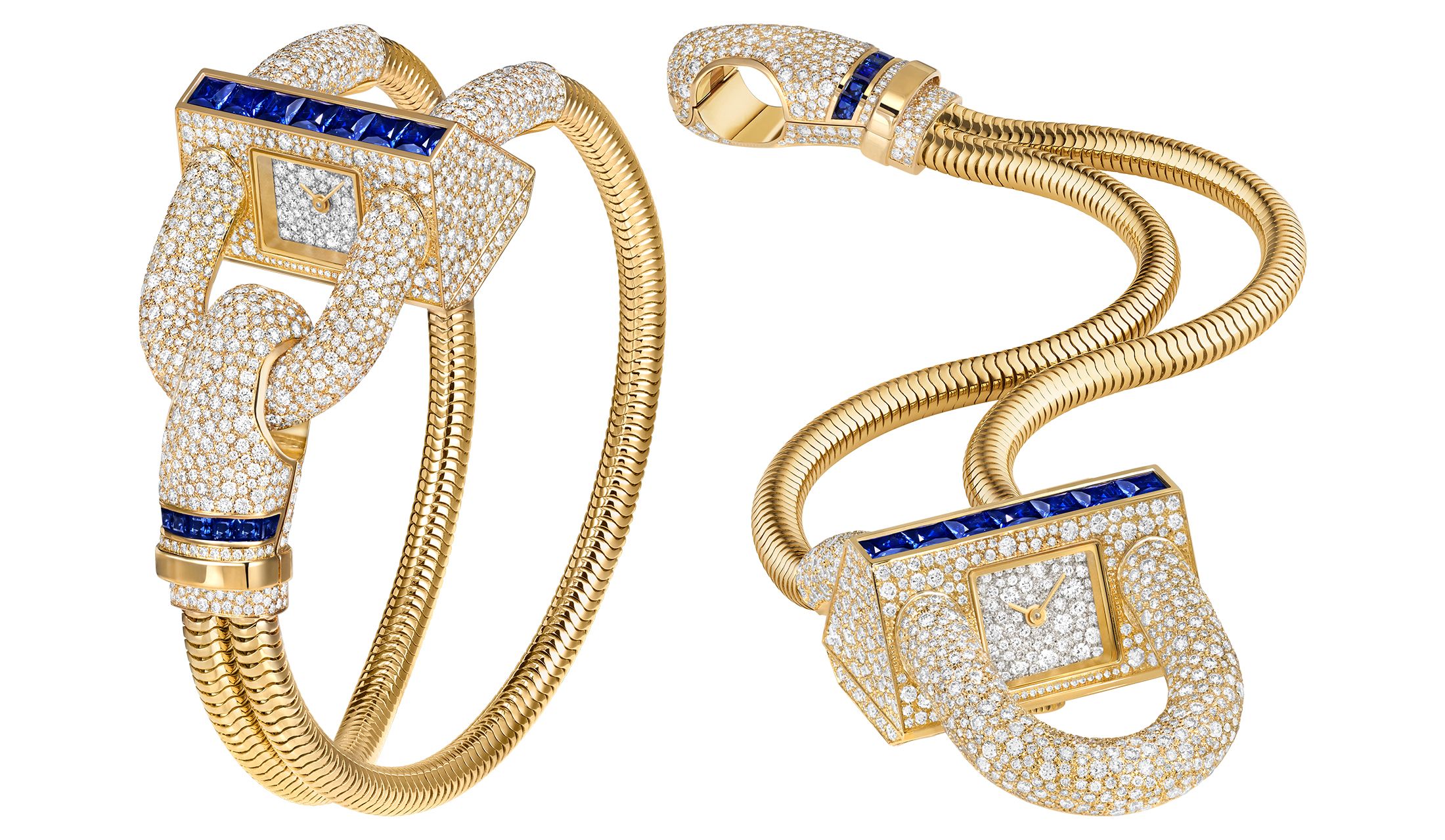 今回の新作では、華やかなイエローゴールドのブレスレットに、さまざまな大きさのダイヤモンドをスノーセッティングで敷き詰めたケースを組み合わせ、その側面にプリンセスカット サファイアを直線的にセット。このクールでエレガントなカラーコンビネーションは、スクエアカット サファイアのラインで飾られたクラスプでも繰り返され、360度どの角度から見ても非凡な輝きを放ちます。
