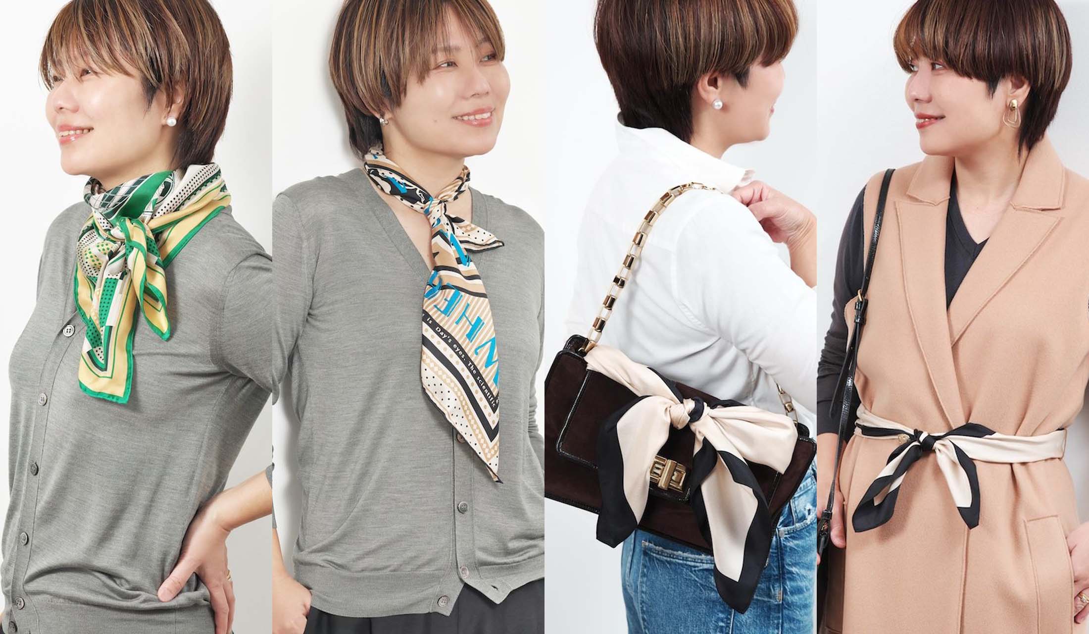 今回はこれまでの連載の中から、“スカーフアレンジ”術をまとめてご紹介。、「アシンメトリーなスカーフ使い」と「チャーム的なスカーフ使い」をテーマに、上品に着映えるコツをお届けします。