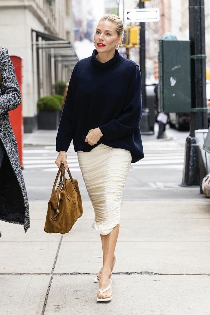 シエナ・ミラーは、ネイビーとパールホワイトの上品配色で洗練された印象を獲得。親近感のあるオーバーサイズニットも、ノーブルなカラーを選びつつ、ツヤを湛えたスカートを合わせればクラスアップが実現。ペンシルラインの白スカートだからこそ、メリハリと軽やかさを両立できます。